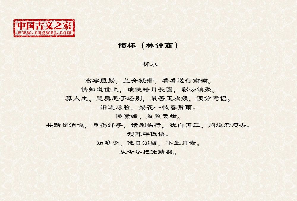 离宴殷勤,兰舟凝滞,看看送行南浦。情知道世上,难使皓月长圆,彩云镇聚。算人生、悲莫悲于轻别,最苦正欢娱,便分鸳侣。泪流琼脸,梨花一枝春带雨。惨黛蛾、盈盈无绪。共黯然消魂,重携纤手,话别临行,犹自再三、问道君须去。频耳畔低语。知多少、他日深盟,平生丹素。从今尽把凭鳞羽。