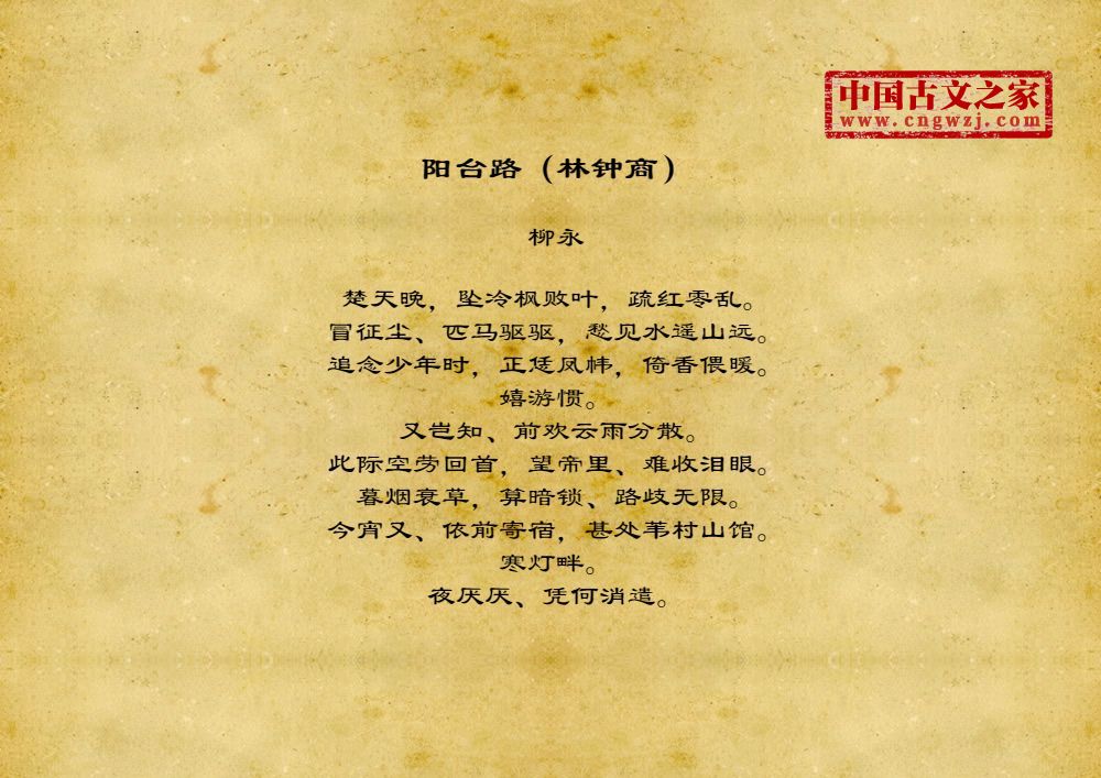 楚天晚,坠冷枫败叶,疏红零乱。冒征尘、匹马驱驱,愁见水遥山远。追念少年时,正恁凤帏,倚香偎暖。嬉游惯。又岂知、前欢云雨分散。此际空劳回首,望帝里、难收泪眼。暮烟衰草,算暗锁、路歧无限。今宵又、依前寄宿,甚处苇村山馆。寒灯畔。夜厌厌、凭何消遣。
