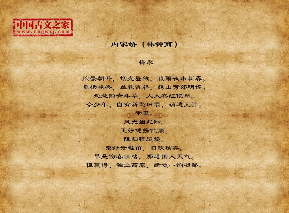 柳永,(约987年—约1053年)北宋著名词人,婉约派创始人物。汉族,崇安(今福建武夷山)人,原名三变,字景庄,后改名永,字耆卿,排行第七,又称柳七。