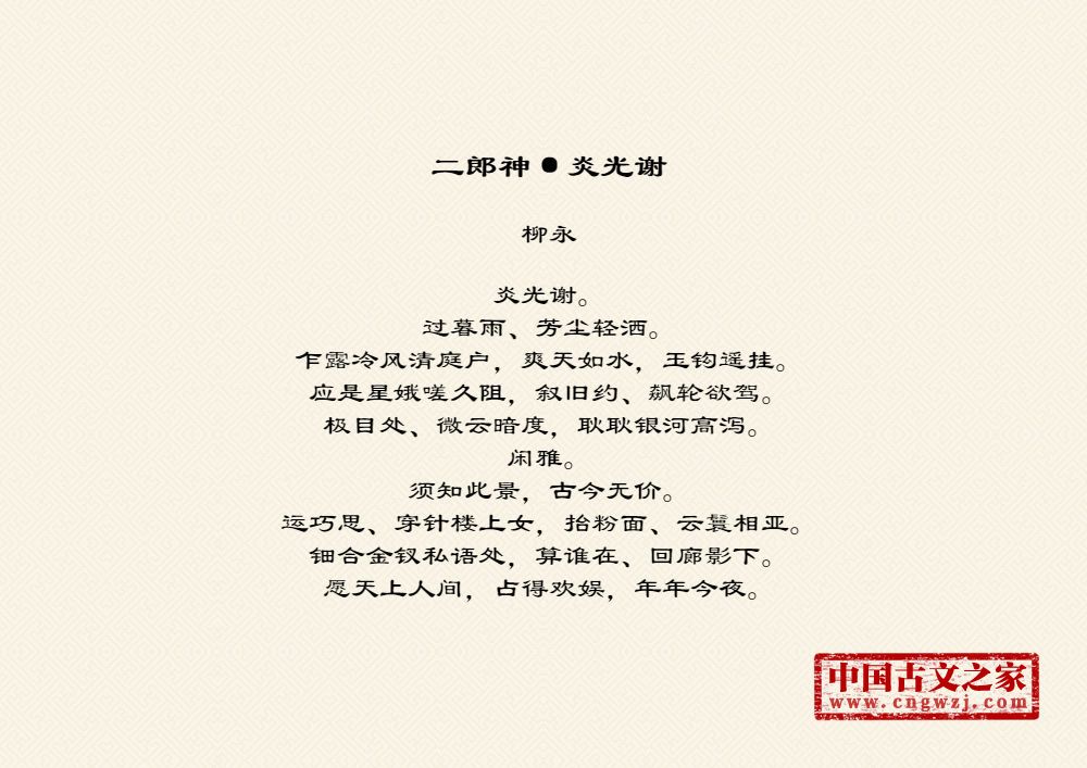 炎光谢。过暮雨、芳尘轻洒。乍露冷风清庭户,爽天如水,玉钩遥挂。应是星娥嗟久阻,叙旧约、飙轮欲驾。极目处、微云暗度,耿耿银河高泻。闲雅。须知此景,古今无价。运巧思、穿针楼上女,抬粉面、云鬟相亚。钿合金钗私语处,算谁在、回廊影下。愿天上人间,占得欢娱,年年今夜。