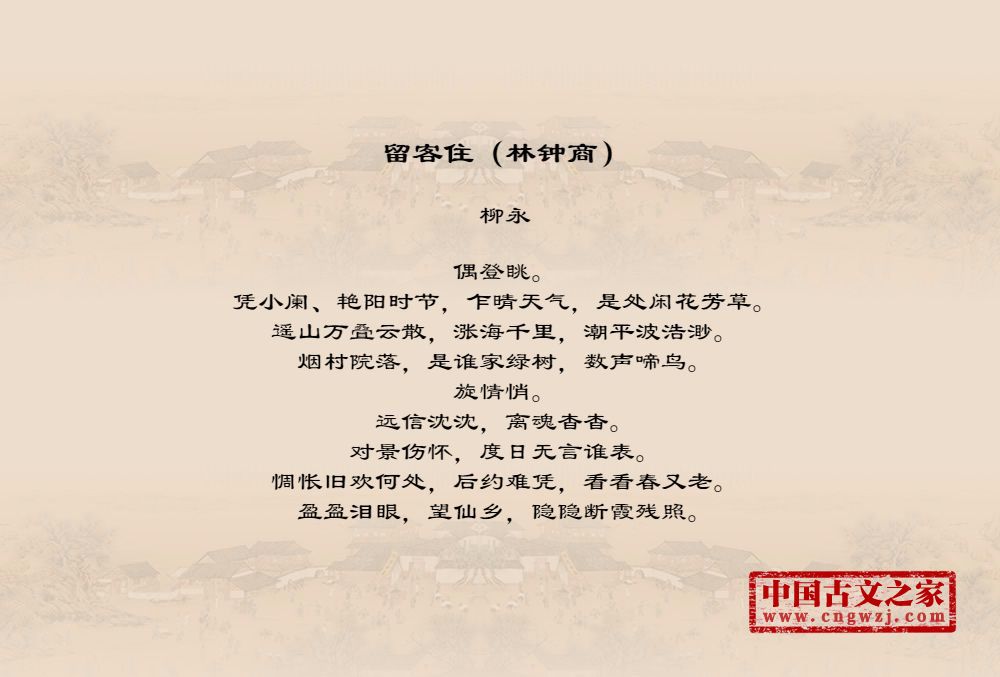 偶登眺。凭小阑、艳阳时节,乍晴天气,是处闲花芳草。遥山万叠云散,涨海千里,潮平波浩渺。烟村院落,是谁家绿树,数声啼鸟。旋情悄。远信沈沈,离魂杳杳。对景伤怀,度日无言谁表。惆怅旧欢何处,后约难凭,看看春又老。盈盈泪眼,望仙乡,隐隐断霞残照。