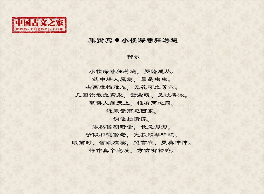 小楼深巷狂游遍,罗绮成丛。就中堪人属意,最是虫虫。有画难描雅态,无花可比芳容。几回饮散良宵永,鸳衾暖、凤枕香浓。算得人间天上,惟有两心同。近来云雨忽西东。诮恼损情悰。纵然偷期暗会,长是匆匆。争似和鸣偕老,免教敛翠啼红。眼前时、暂疏欢宴,盟言在、更莫忡忡。待作真个宅院,方信有初终。