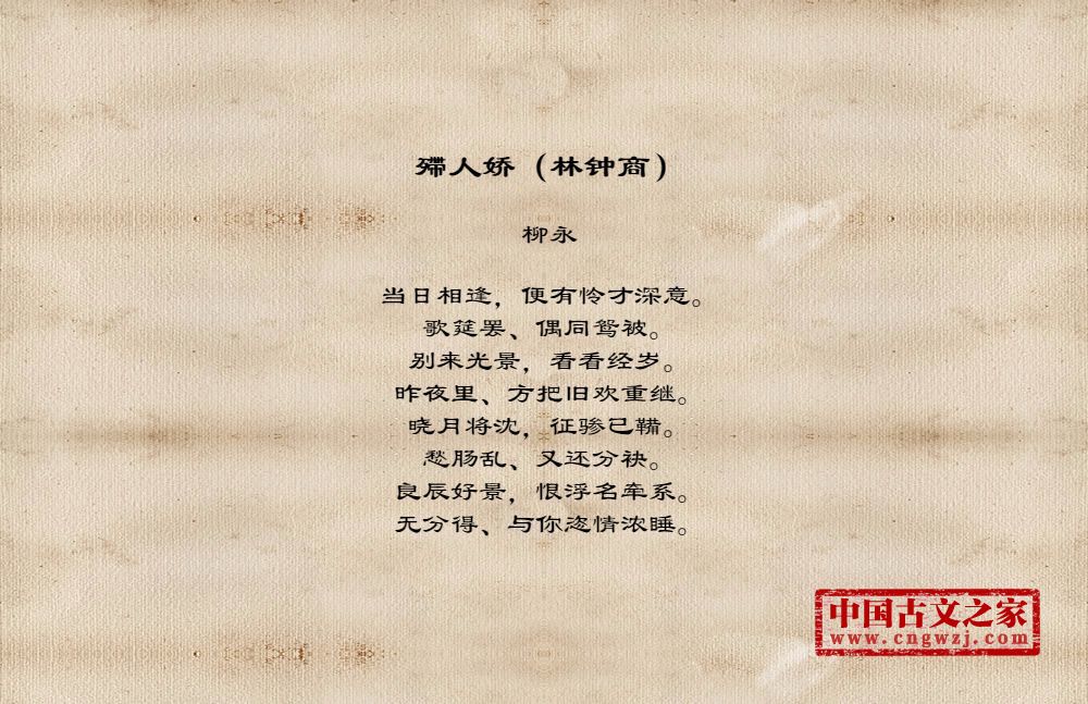 柳永,(约987年—约1053年)北宋著名词人,婉约派创始人物。汉族,崇安(今福建武夷山)人,原名三变,字景庄,后改名永,字耆卿,排行第七,又称柳七。