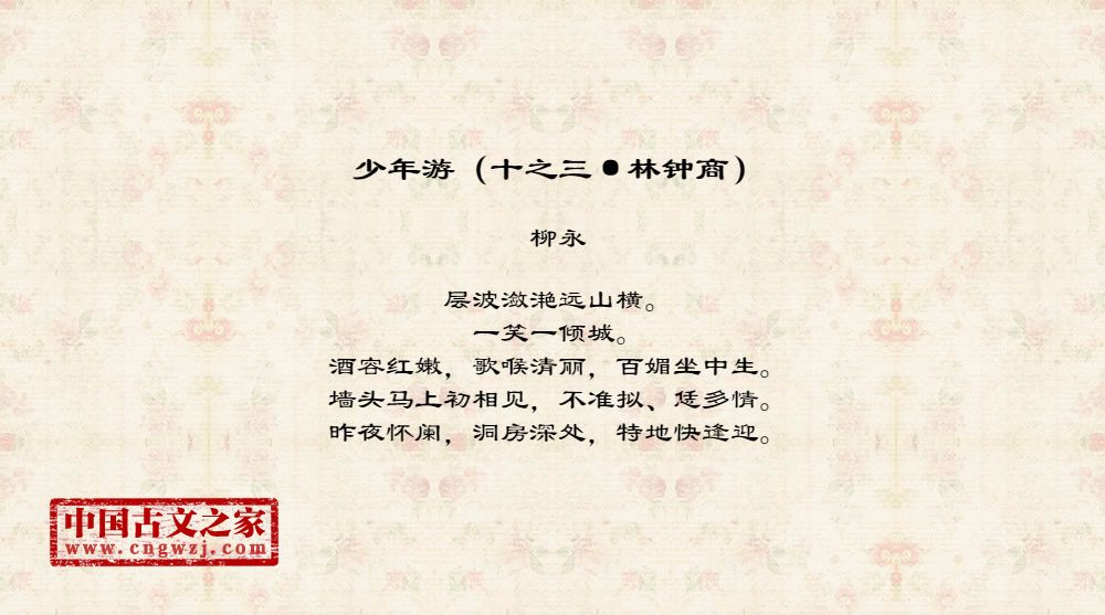 柳永,(约987年—约1053年)北宋著名词人,婉约派创始人物。汉族,崇安(今福建武夷山)人,原名三变,字景庄,后改名永,字耆卿,排行第七,又称柳七。
