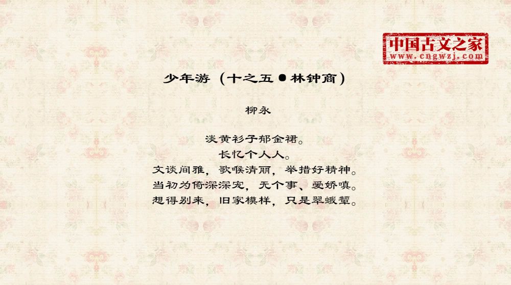 淡黄衫子郁金裙。长忆个人人。文谈间雅,歌喉清丽,举措好精神。当初为倚深深宠,无个事、爱娇嗔。想得别来,旧家模样,只是翠蛾颦。
