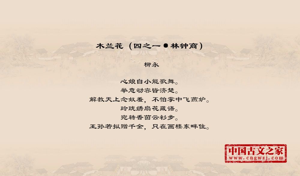 心娘自小能歌舞。举意动容皆济楚。解教天上念奴羞,不怕掌中飞燕妒。玲珑绣扇花藏语。宛转香茵云衫步。王孙若拟赠千金,只在画楼东畔住。