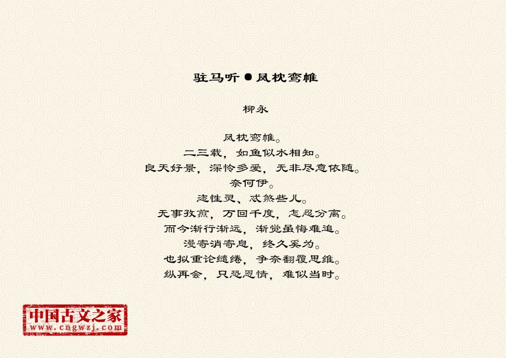 凤枕鸾帷。二三载,如鱼似水相知。良天好景,深怜多爱,无非尽意依随。奈何伊。恣性灵、忒煞些儿。无事孜煎,万回千度,怎忍分离。而今渐行渐远,渐觉虽悔难追。漫寄消寄息,终久奚为。也拟重论缱绻,争奈翻覆思维。纵再会,只恐恩情,难似当时。