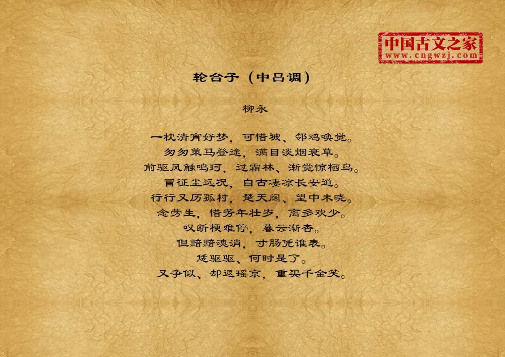 一枕清宵好梦,可惜被、邻鸡唤觉。匆匆策马登途,满目淡烟衰草。前驱风触鸣珂,过霜林、渐觉惊栖鸟。冒征尘远况,自古凄凉长安道。行行又历孤村,楚天阔、望中未晓。念劳生,惜芳年壮岁,离多欢少。叹断梗难停,暮云渐杳。但黯黯魂消,寸肠凭谁表。恁驱驱、何时是了。又争似、却返瑶京,重买千金笑。