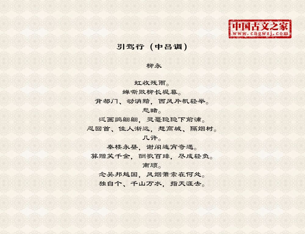 虹收残雨。蝉嘶败柳长堤暮。背都门、动消黯,西风片帆轻举。愁睹。泛画鹢翩翩,灵鼍隐隐下前浦。忍回首、佳人渐远,想高城、隔烟树。几许。秦楼永昼,谢阁连宵奇遇。算赠笑千金,酬歌百琲,尽成轻负。南顾。念吴邦越国,风烟萧索在何处。独自个、千山万水,指天涯去。