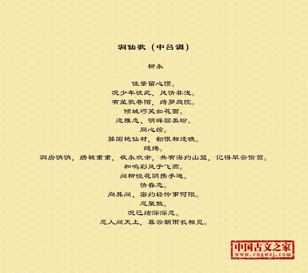 佳景留心惯。况少年彼此,风情非浅。有笙歌巷陌,绮罗庭院。倾城巧笑如花面。恣雅态、明眸回美盼。同心绾。算国艳仙材,翻恨相逢晚。缱绻。洞房悄悄,绣被重重,夜永欢余,共有海约山盟,记得翠云偷翦。和鸣彩凤于飞燕。间柳径花阴携手遍。情眷恋。向其间、密约轻怜事何限。忍聚散。况已结深深愿。愿人间天上,暮云朝雨长相见。