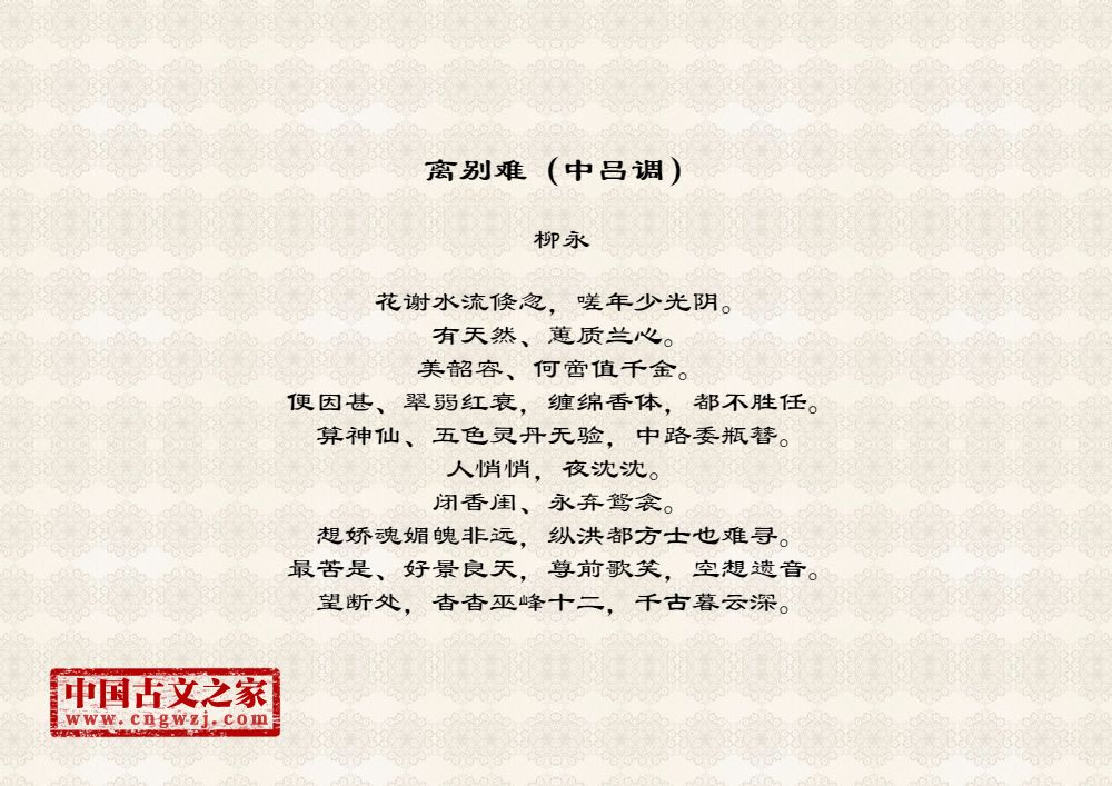 柳永,(约987年—约1053年)北宋著名词人,婉约派创始人物。汉族,崇安(今福建武夷山)人,原名三变,字景庄,后改名永,字耆卿,排行第七,又称柳七。