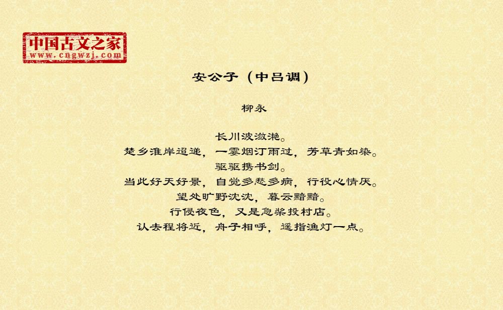 长川波潋滟。楚乡淮岸迢递,一霎烟汀雨过,芳草青如染。驱驱携书剑。当此好天好景,自觉多愁多病,行役心情厌。望处旷野沈沈,暮云黯黯。行侵夜色,又是急桨投村店。认去程将近,舟子相呼,遥指渔灯一点。