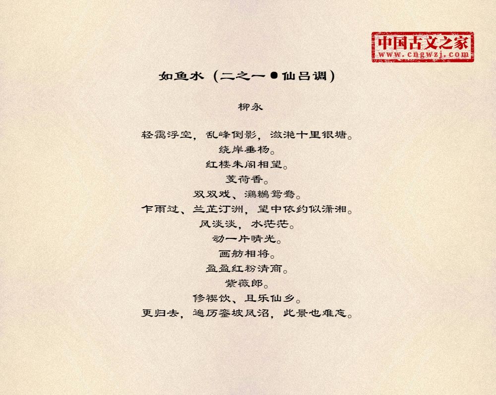 轻霭浮空,乱峰倒影,潋滟十里银塘。绕岸垂杨。红楼朱阁相望。芰荷香。双双戏、鸂鶒鸳鸯。乍雨过、兰芷汀洲,望中依约似潇湘。风淡淡,水茫茫。动一片晴光。画舫相将。盈盈红粉清商。紫薇郎。修禊饮、且乐仙乡。更归去,遍历銮坡凤沼,此景也难忘。