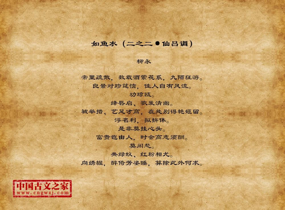帝里疏散,数载酒萦花系,九陌狂游。良景对珍筵恼,佳人自有风流。劝琼瓯。绛唇启、歌发清幽。被举措、艺足才高,在处别得艳姬留。浮名利,拟拚休。是非莫挂心头。富贵岂由人,时会高志须酬。莫闲愁。共绿蚁、红粉相尤。向绣幄,醉倚芳姿睡,算除此外何求。