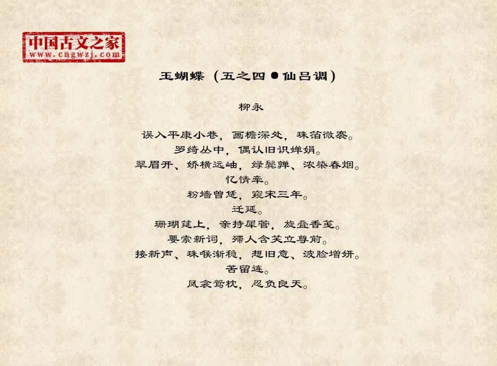 误入平康小巷,画檐深处,珠箔微褰。罗绮丛中,偶认旧识婵娟。翠眉开、娇横远岫,绿鬓亸、浓染春烟。忆情牵。粉墙曾恁,窥宋三年。迁延。珊瑚筵上,亲持犀管,旋叠香笺。要索新词,殢人含笑立尊前。接新声、珠喉渐稳,想旧意、波脸增妍。苦留连。凤衾鸳枕,忍负良天。