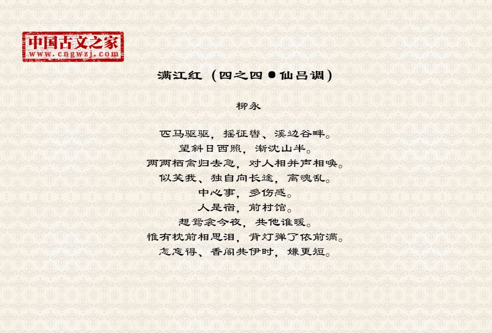 匹马驱驱,摇征辔、溪边谷畔。望斜日西照,渐沈山半。两两栖禽归去急,对人相并声相唤。似笑我、独自向长途,离魂乱。中心事,多伤感。人是宿,前村馆。想鸳衾今夜,共他谁暖。惟有枕前相思泪,背灯弹了依前满。怎忘得、香阁共伊时,嫌更短。
