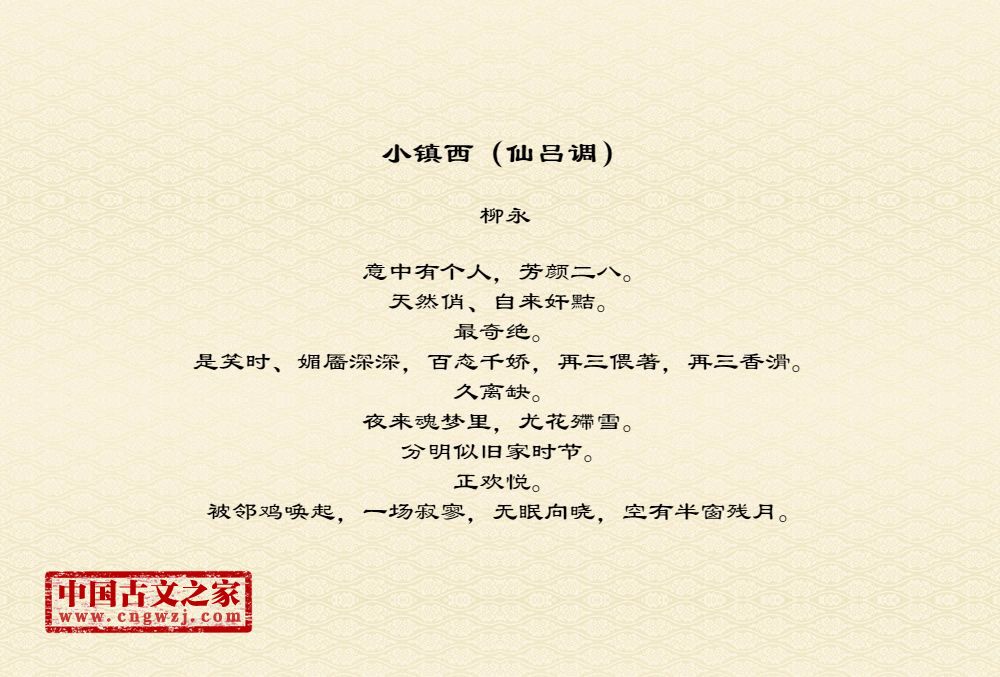 意中有个人,芳颜二八。天然俏、自来奸黠。最奇绝。是笑时、媚靥深深,百态千娇,再三偎著,再三香滑。久离缺。夜来魂梦里,尤花殢雪。分明似旧家时节。正欢悦。被邻鸡唤起,一场寂寥,无眠向晓,空有半窗残月。