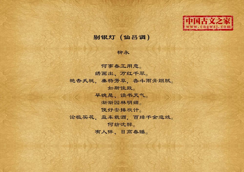 何事春工用意。绣画出、万红千翠。艳杏夭桃,垂杨芳草,各斗雨膏烟腻。如斯佳致。早晚是、读书天气。渐渐园林明媚。便好安排欢计。论槛买花,盈车载酒,百琲千金邀妓。何妨沈醉。有人伴、日高春睡。