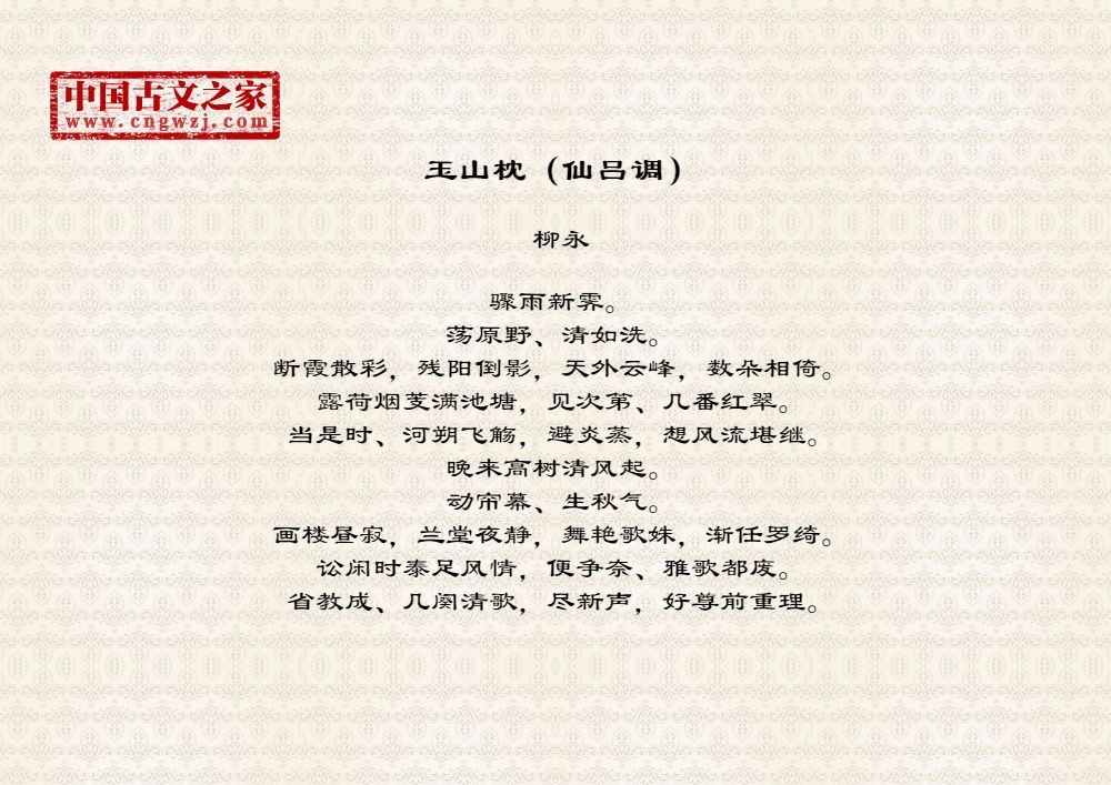 骤雨新霁。荡原野、清如洗。断霞散彩,残阳倒影,天外云峰,数朵相倚。露荷烟芰满池塘,见次第、几番红翠。当是时、河朔飞觞,避炎蒸,想风流堪继。晚来高树清风起。动帘幕、生秋气。画楼昼寂,兰堂夜静,舞艳歌姝,渐任罗绮。讼闲时泰足风情,便争奈、雅歌都废。省教成、几阕清歌,尽新声,好尊前重理。