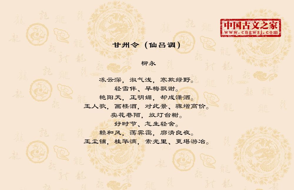 冻云深,淑气浅,寒欺绿野。轻雪伴、早梅飘谢。艳阳天,正明媚,却成潇洒。玉人歌,画楼酒,对此景、骤增高价。卖花巷陌,放灯台榭。好时节、怎生轻舍。赖和风,荡霁霭,廓清良夜。玉尘铺,桂华满,素光里、更堪游冶。
