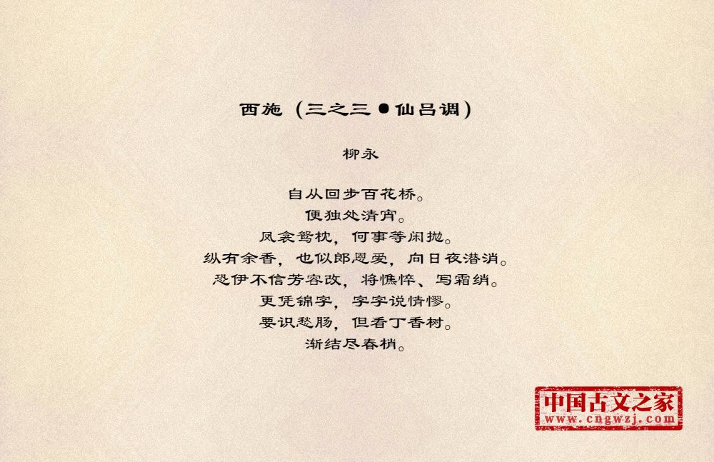 自从回步百花桥。便独处清宵。凤衾鸳枕,何事等闲抛。纵有余香,也似郎恩爱,向日夜潜消。恐伊不信芳容改,将憔悴、写霜绡。更凭锦字,字字说情憀。要识愁肠,但看丁香树。渐结尽春梢。