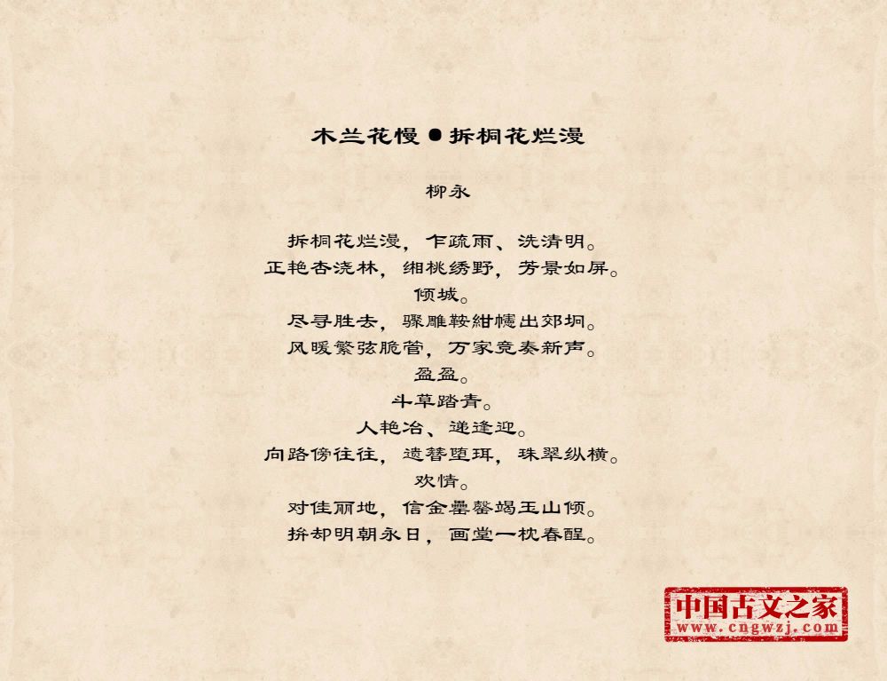 拆桐花烂漫,乍疏雨、洗清明。正艳杏浇林,缃桃绣野,芳景如屏。倾城。尽寻胜去,骤雕鞍紺幰出郊坰。风暖繁弦脆管,万家竞奏新声。盈盈。斗草踏青。人艳冶、递逢迎。向路傍往往,遗簪堕珥,珠翠纵横。欢情。对佳丽地,信金罍罄竭玉山倾。拚却明朝永日,画堂一枕春酲。