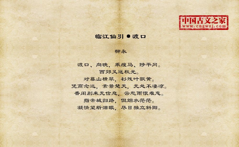 渡口、向晚,乘瘦马、陟平冈。西郊又送秋光。对暮山横翠,衫残叶飘黄。凭高念远,素景楚天,无处不凄凉。香闺别来无信息,云愁雨恨难忘。指帝城归路,但烟水茫茫。凝情望断泪眼,尽日独立斜阳。