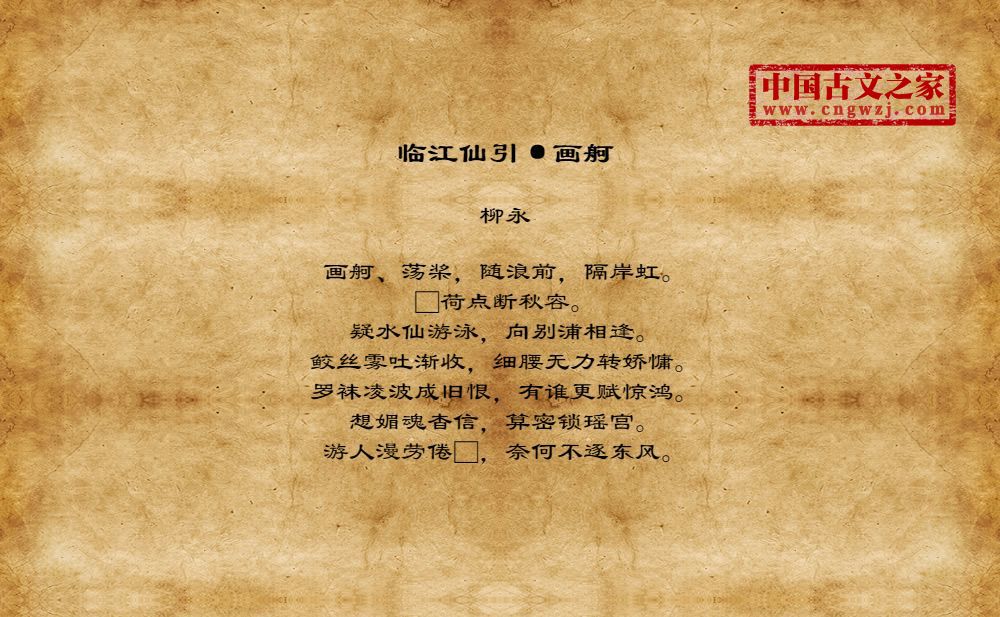 画舸、荡桨,随浪前,隔岸虹。□荷点断秋容。疑水仙游泳,向别浦相逢。鲛丝雾吐渐收,细腰无力转娇慵。罗袜凌波成旧恨,有谁更赋惊鸿。想媚魂杳信,算密锁瑶宫。游人漫劳倦□,奈何不逐东风。