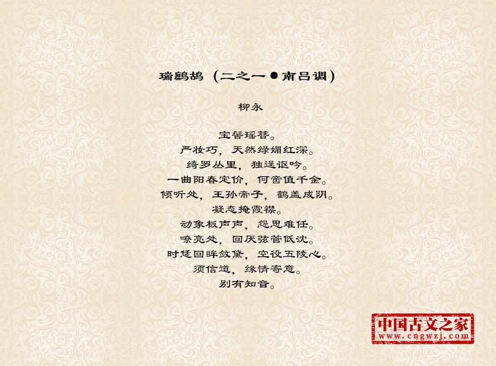 宝髻瑶簪。严妆巧,天然绿媚红深。绮罗丛里,独逞讴吟。一曲阳春定价,何啻值千金。倾听处,王孙帝子,鹤盖成阴。凝态掩霞襟。动象板声声,怨思难任。嘹亮处,回厌弦管低沈。时恁回眸敛黛,空役五陵心。须信道,缘情寄意。别有知音。