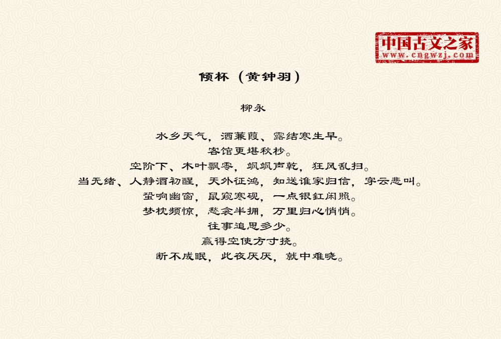 水乡天气,洒蒹葭、露结寒生早。客馆更堪秋杪。空阶下、木叶飘零,飒飒声乾,狂风乱扫。当无绪、人静酒初醒,天外征鸿,知送谁家归信,穿云悲叫。蛩响幽窗,鼠窥寒砚,一点银釭闲照。梦枕频惊,愁衾半拥,万里归心悄悄。往事追思多少。赢得空使方寸挠。断不成眠,此夜厌厌,就中难晓。
