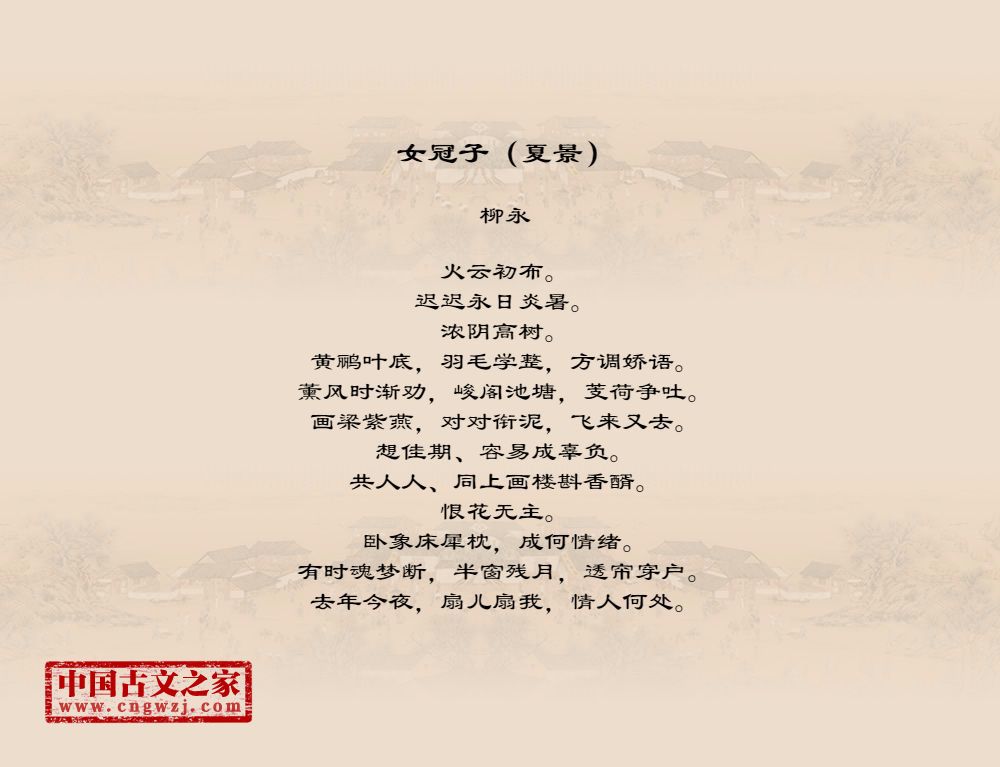 火云初布。迟迟永日炎暑。浓阴高树。黄鹂叶底,羽毛学整,方调娇语。薰风时渐劝,峻阁池塘,芰荷争吐。画梁紫燕,对对衔泥,飞来又去。想佳期、容易成辜负。共人人、同上画楼斟香醑。恨花无主。卧象床犀枕,成何情绪。有时魂梦断,半窗残月,透帘穿户。去年今夜,扇儿扇我,情人何处。