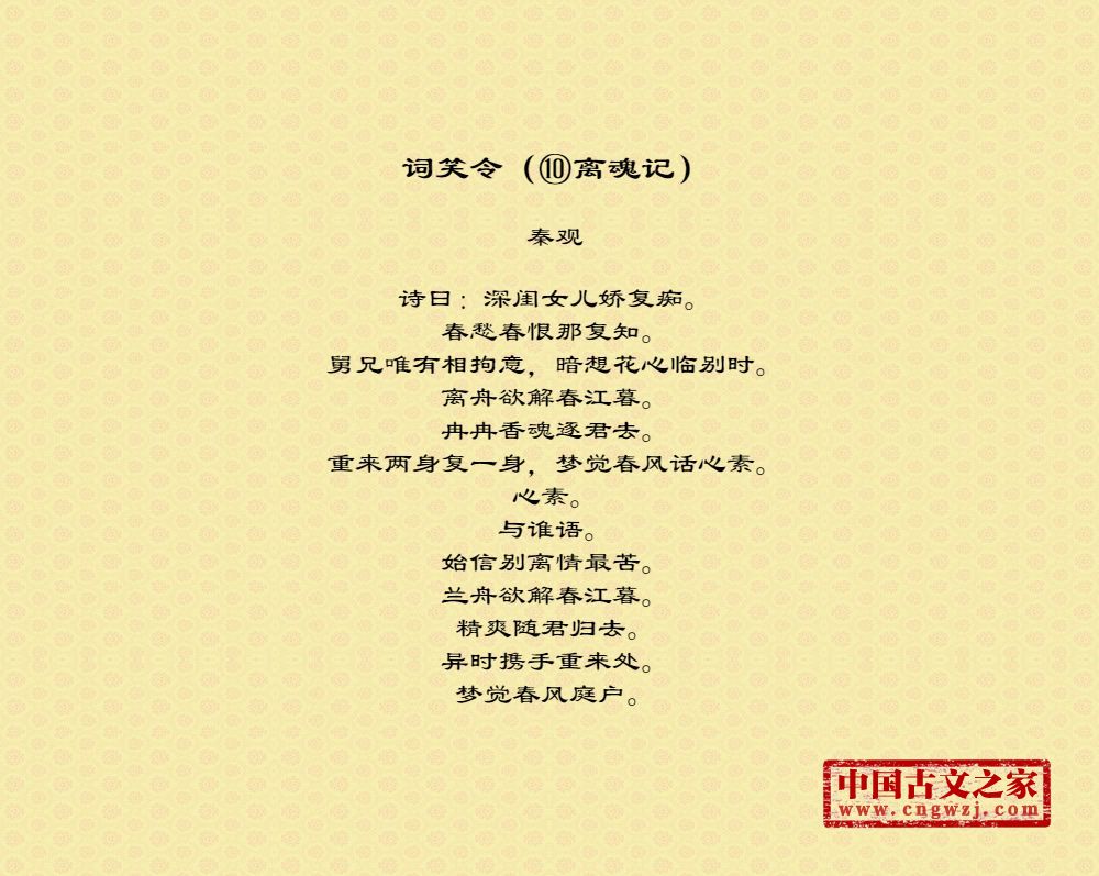 诗曰:深闺女儿娇复痴。春愁春恨那复知。舅兄唯有相拘意,暗想花心临别时。离舟欲解春江暮。冉冉香魂逐君去。重来两身复一身,梦觉春风话心素。心素。与谁语。始信别离情最苦。兰舟欲解春江暮。精爽随君归去。异时携手重来处。梦觉春风庭户。