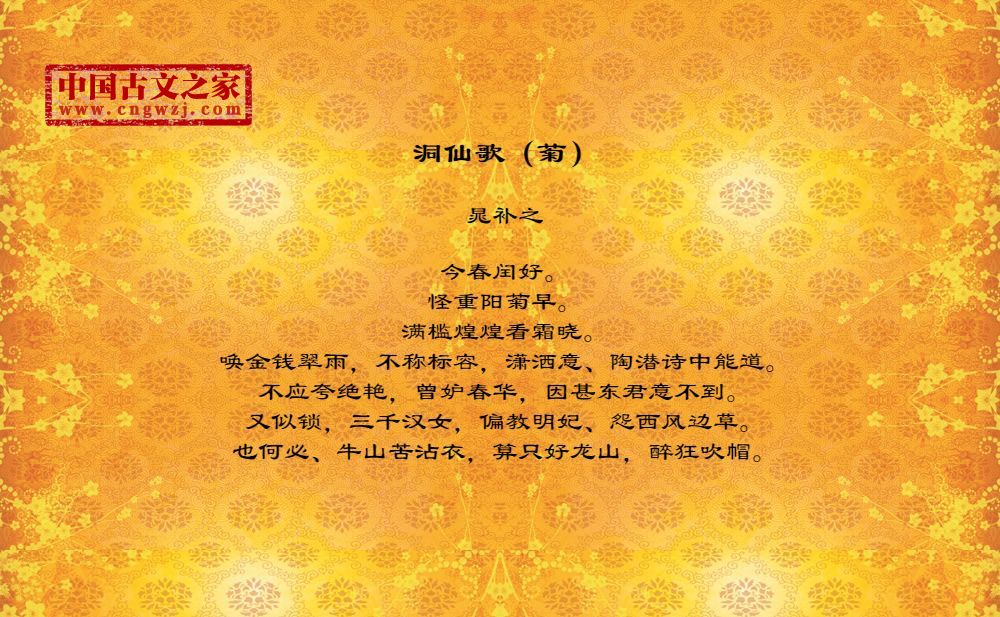 今春闰好。怪重阳菊早。满槛煌煌看霜晓。唤金钱翠雨,不称标容,潇洒意、陶潜诗中能道。不应夸绝艳,曾妒春华,因甚东君意不到。又似锁,三千汉女,偏教明妃、怨西风边草。也何必、牛山苦沾衣,算只好龙山,醉狂吹帽。