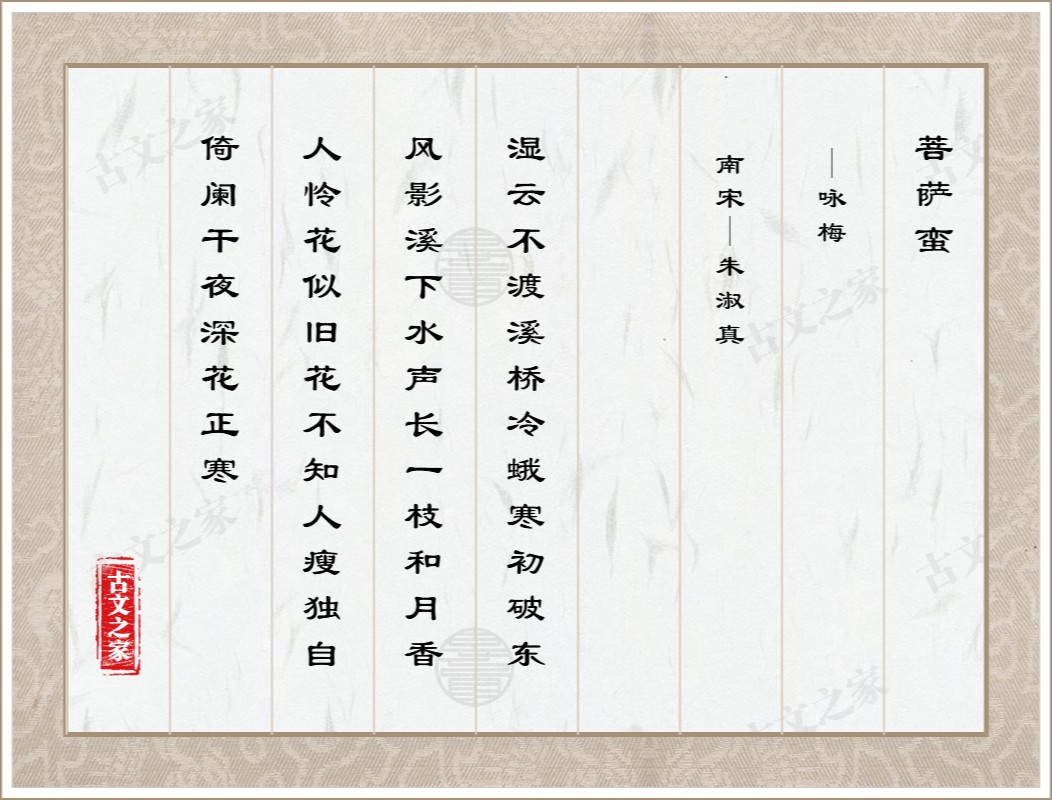小桥下,潺潺的溪水正向远方流淌,一枝盛开的梅花在清冷的月光中散发出淡淡的幽香。