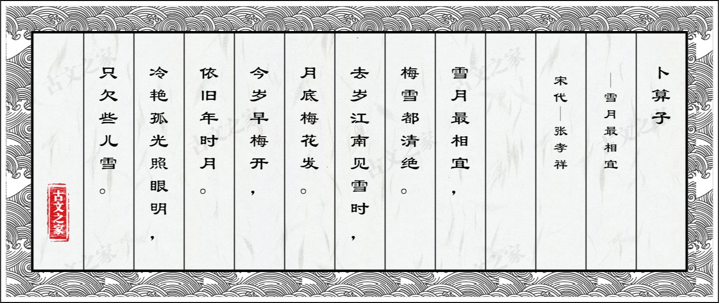 雪月最相宜,梅雪都清绝。去岁江南见雪时,月底梅花发。 今岁早梅开,依旧年时月。冷艳孤光照眼明,只欠些儿雪。