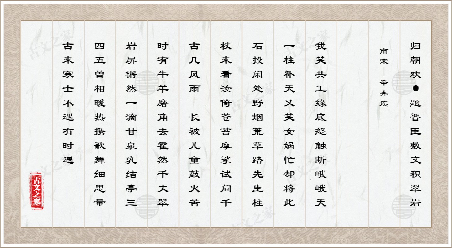 倚靠在长满苍苔的积翠岩上,轻轻抚摸悄悄探问,千百年来,你看过了多少沉浮,经历了多少风雨?