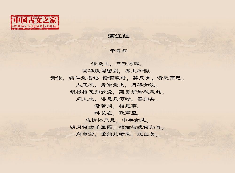涂堂上,三鼓方醒。国华赋词留别,席上和韵。青涂,端仁堂名也 宿酒醒时,算只有、清愁而已。人正在、青涂堂上,月华如洗。纸帐梅花归梦觉,莼羹鲈鲙秋风起。问人生、得意几何时,吾归矣。君若问,相思事。料长在,歌声里。这情怀只是,中年如此。明月何妨千里隔,顾君与我何如耳。向尊前、重约几时来,江山美。