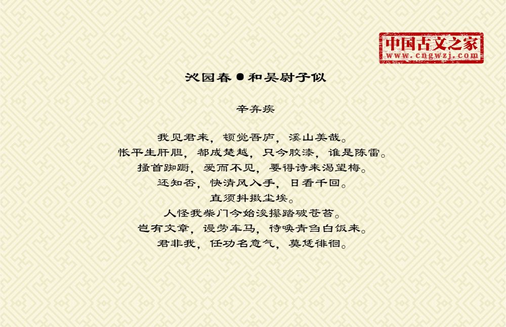 我见君来,顿觉吾庐,溪山美哉。怅平生肝胆,都成楚越,只今胶漆,谁是陈雷。搔首踟蹰,爱而不见,要得诗来渴望梅。还知否,快清风入手,日看千回。直须抖擞尘埃。人怪我柴门今始浚攥踏破苍苔。岂有文章,谩劳车马,待唤青刍白饭来。君非我,任功名意气,莫恁徘徊。