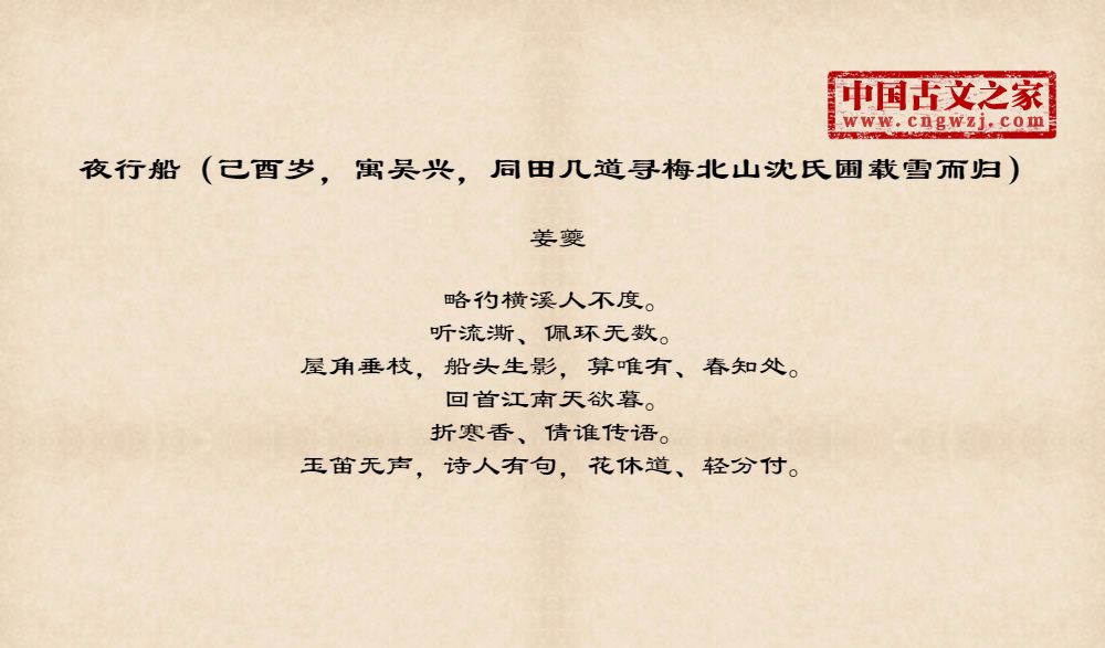 《夜行船(己酉岁,寓吴兴,同田几道寻梅北山沈氏圃载雪而归)》的原文打印版(姜夔)