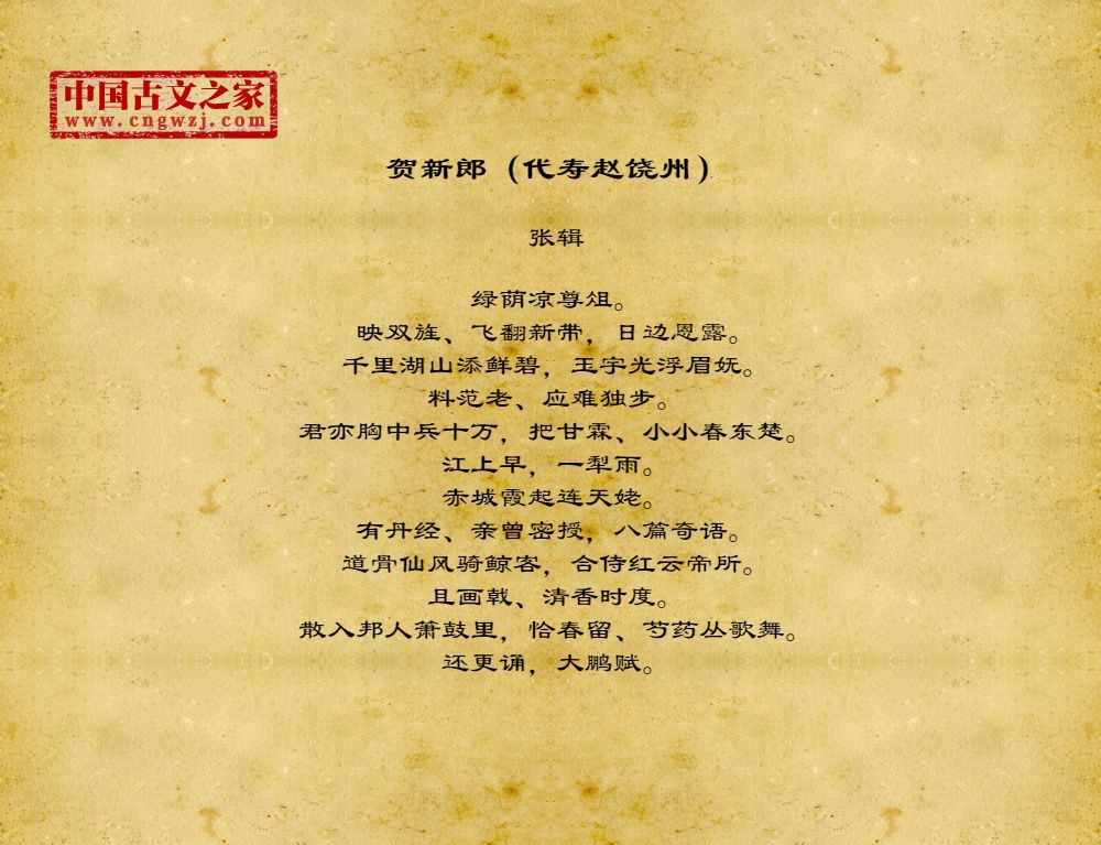 绿荫凉尊俎。映双旌、飞翻新带,日边恩露。千里湖山添鲜碧,玉宇光浮眉妩。料范老、应难独步。君亦胸中兵十万,把甘霖、小小春东楚。江上早,一犁雨。赤城霞起连天姥。有丹经、亲曾密授,八篇奇语。道骨仙风骑鲸客,合侍红云帝所。且画戟、清香时度。散入邦人箫鼓里,恰春留、芍药丛歌舞。还更诵,大鹏赋。
