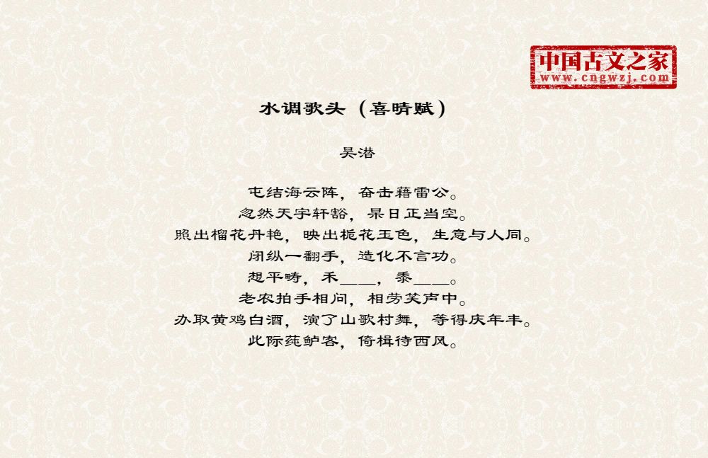 屯结海云阵,奋击藉雷公。忽然天宇轩豁,杲日正当空。照出榴花丹艳,映出栀花玉色,生意与人同。闭纵一翻手,造化不言功。想平畴,禾__,黍__。老农拍手相问,相劳笑声中。办取黄鸡白酒,演了山歌村舞,等得庆年丰。此际莼鲈客,倚楫待西风。