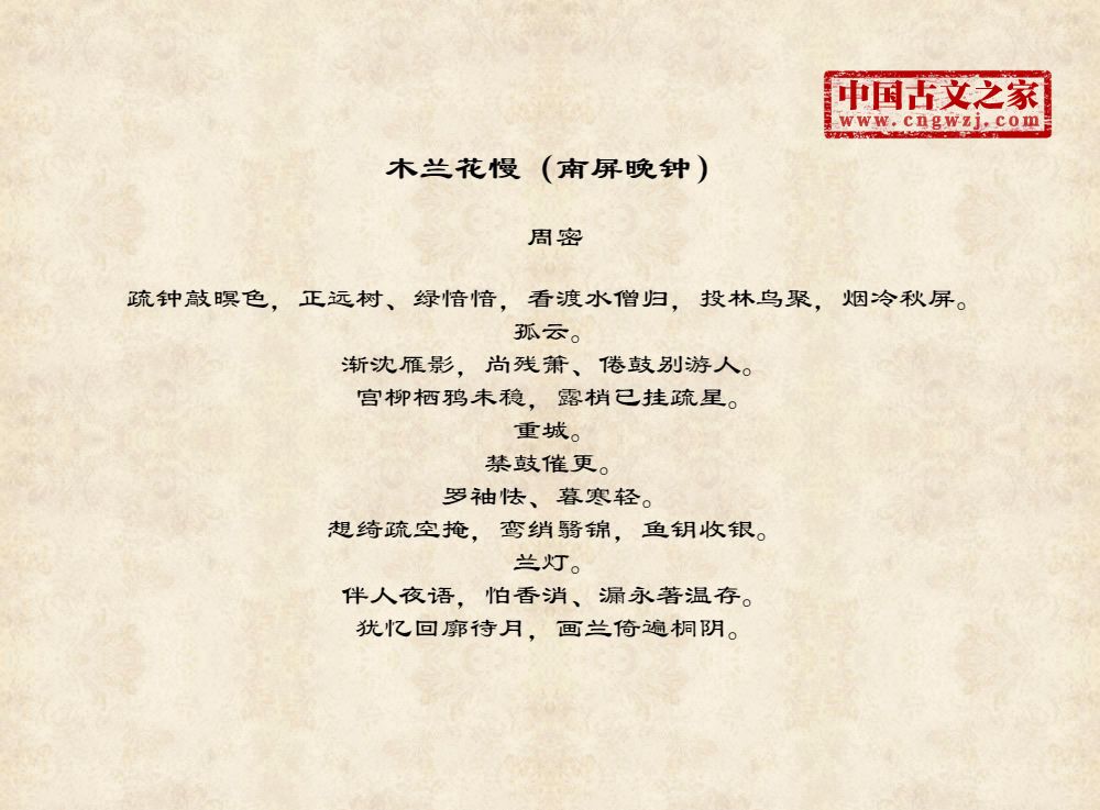 周密(1232-1298),字公谨,号草窗,又号四水潜夫、弁阳老人、华不注山人,南宋词人、文学家。祖籍济南,流寓吴兴(今浙江湖州)。宋德右间为义乌县(