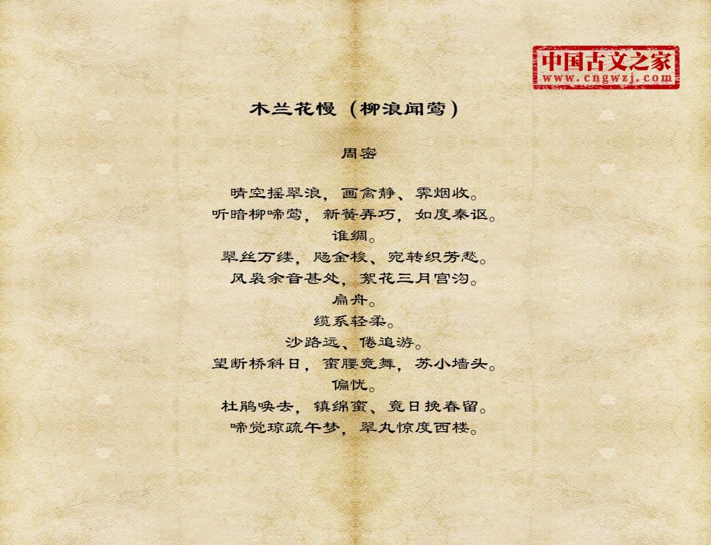 周密(1232-1298),字公谨,号草窗,又号四水潜夫、弁阳老人、华不注山人,南宋词人、文学家。祖籍济南,流寓吴兴(今浙江湖州)。宋德右间为义乌县(