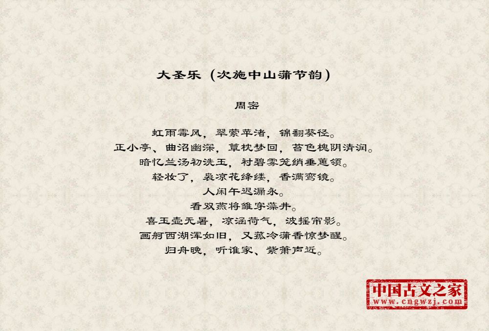 周密(1232-1298),字公谨,号草窗,又号四水潜夫、弁阳老人、华不注山人,南宋词人、文学家。祖籍济南,流寓吴兴(今浙江湖州)。宋德右间为义乌县(