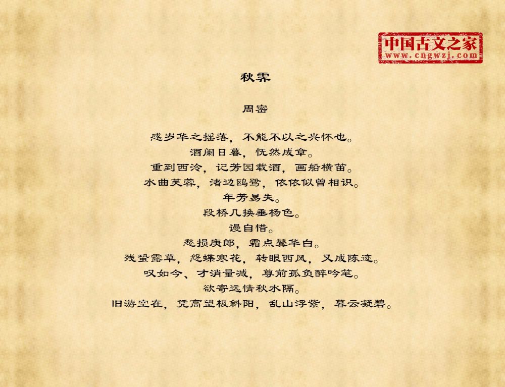 周密(1232-1298),字公谨,号草窗,又号四水潜夫、弁阳老人、华不注山人,南宋词人、文学家。祖籍济南,流寓吴兴(今浙江湖州)。宋德右间为义乌县(