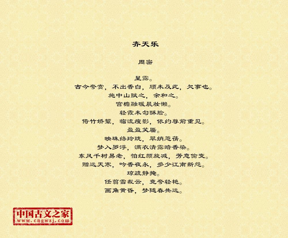 周密(1232-1298),字公谨,号草窗,又号四水潜夫、弁阳老人、华不注山人,南宋词人、文学家。祖籍济南,流寓吴兴(今浙江湖州)。宋德右间为义乌县(