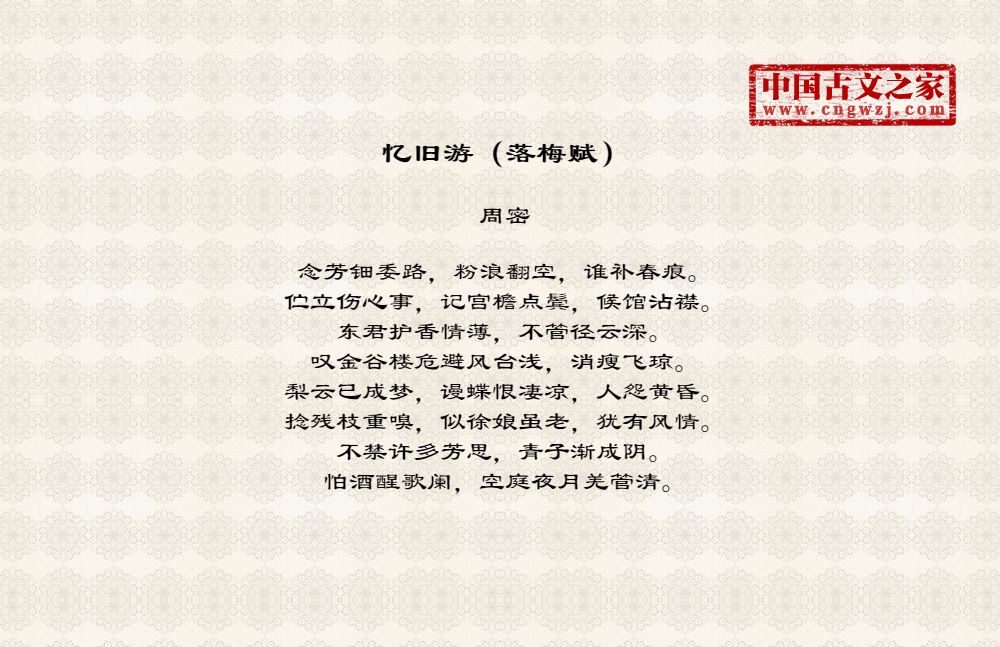周密(1232-1298),字公谨,号草窗,又号四水潜夫、弁阳老人、华不注山人,南宋词人、文学家。祖籍济南,流寓吴兴(今浙江湖州)。宋德右间为义乌县(