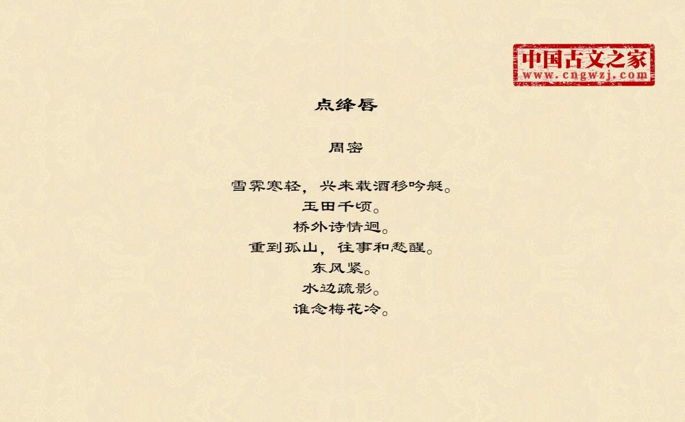 周密(1232-1298),字公谨,号草窗,又号四水潜夫、弁阳老人、华不注山人,南宋词人、文学家。祖籍济南,流寓吴兴(今浙江湖州)。宋德右间为义乌县(