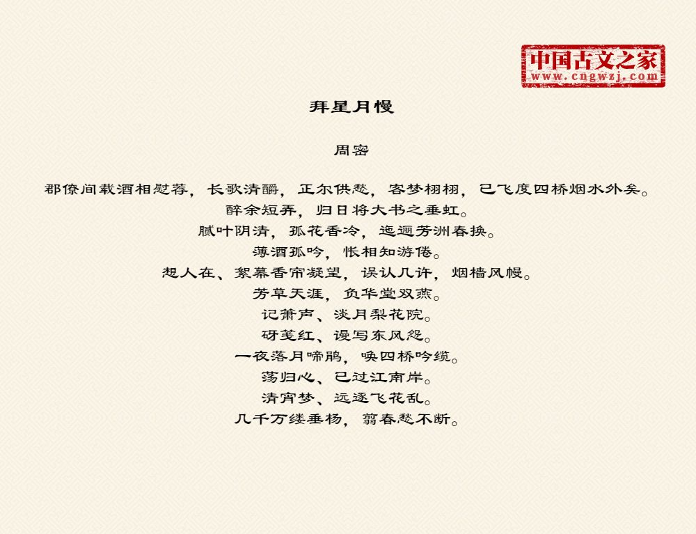 周密(1232-1298),字公谨,号草窗,又号四水潜夫、弁阳老人、华不注山人,南宋词人、文学家。祖籍济南,流寓吴兴(今浙江湖州)。宋德右间为义乌县(