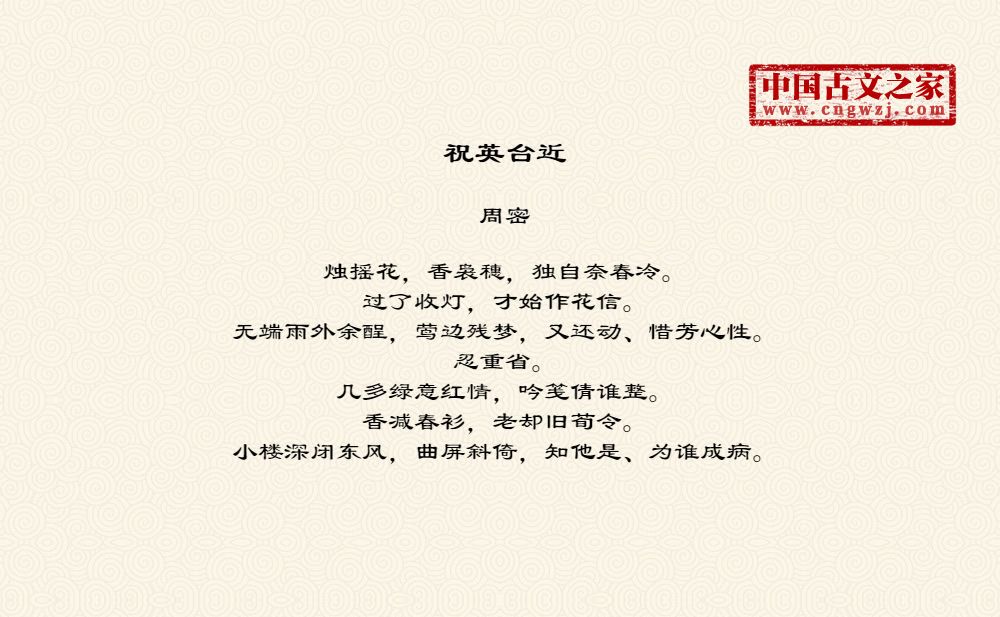 周密(1232-1298),字公谨,号草窗,又号四水潜夫、弁阳老人、华不注山人,南宋词人、文学家。祖籍济南,流寓吴兴(今浙江湖州)。宋德右间为义乌县(